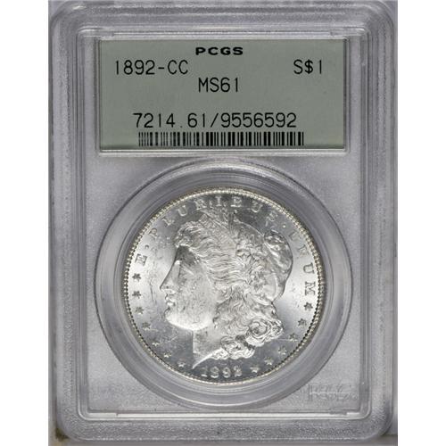 <B>1892-CC<img border='0' src='http://www.heritagecoins.com/images/star.gif' width=10 height=10>$1> MS61 PCGS.</B></I> Highly lustrous and well struck with moderate frost on the eagle and largely untoned fields. Scattered abrasions and a series of marks on Liberty's cheek limit the grade.