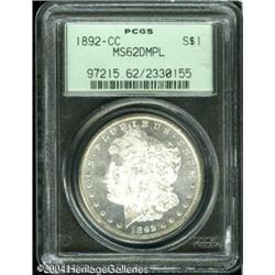 1892-CC S$1 MS62 Deep Mirror Prooflike PCGS. The d <B>1892-CC S$1 MS62 Deep Mirror Prooflike PCGS.</B></I> The deeply mirrored fields of this Silver Dollar are boldly contrasted with the heavily frosted, white devices of this piece. As one would expect from the grade, the surfaces show numerous abrasions, none of which are individually distracting. <BR><BR><B>Important notice:</B> Heritage usually auctions material at the rate of 200-250 lots per hour. On some occasions eBay Live bid software or the Internet may not be able to keep up with the pace of the auction. We recommend placing a realistic absentee bid now as insurance to avoid disappointment. Occasionally the auctioneer may eliminate or reject an eBay Live bid, and the auctioneer may also reopen a lot after the close of the eBay live bidding (usually because we missed an audience bid), and may reject your bid even if it shows you as the winning bidder. By bidding via eBay Live, you agree that Heritage may award the lot to another bidder at its sole discretion under the circumstances described above or any other reasonable circumstances. Since eBay bids are not shown to us until we open the lot on the floor, we treat those bids just like floor bids. In most cases the floor responds before the eBay bid is presented to us, due to Internet lag time, so for consistency we have made it a policy that floor bids are always considered first over tie eBay live bids. Also please note that all Heritage lots purchased through eBay Live carry a 20% Buyer's Premium. Please make sure you read the Terms and Conditions before you bid. This lot is being auctioned in conjunction with a live floor auction by Heritage Galleries & Auctioneers. All final auction and invoice information will be supplied by Heritage Galleries & Auctioneers, and all other information should be considered preliminary. Lot:7627