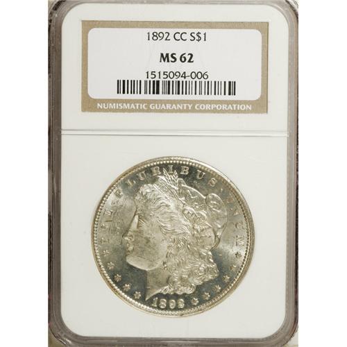 <B>1892-CC S$1 MS62 NGC.</B></I> Lustrous surfaces show a faint blue-beige cast. The design definition is above average for the issue, as some detail is visible on the hair at Liberty's ear and on the eagle's breast feathers. The fields exhibit some prooflike tendencies, thereby accentuating the motifs at various angles. Some light contact marks, fewer than are usually seen on this issue, define the grade.<BR><BR><b>Shipping:</b> Coins & Currency (<a target="_blank" href="http://www.heritageauctions.com/common/shipping.php">view shipping information</a>)