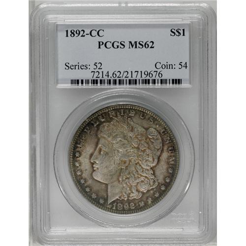 <B>1892-CC<img border='0' src='http://www.heritagecoins.com/images/star.gif' width=10 height=10>$1> MS62 PCGS.</B></I> Despite a number of hidden surface marks that limit the technical grade of this example, the frosty luster and rich toning give it an eye appeal equivalent to a higher numerical grade. Both sides have brilliant underlying luster with deep russet and sea-green toning.