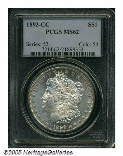 <B>1892-CC<S$1> MS62 PCGS.</B></I> The devices are frosty and the fields have a texture intermediate between satiny and mirrorlike. The central areas are essentially brilliant, with some wisps and blushes of iridescence at the borders.