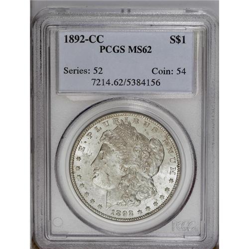 <B>1892-CC<img border='0' src='http://www.heritagecoins.com/images/star.gif' width=10 height=10>$1> MS62 PCGS.</B></I> The obverse has a tiny die crack from star 13 to the date, with a prominent die chip just above the base of the 2. This example is fully lustrous with frosty silver surfaces and limited abrasions. Just a trace of cameo contrast can be seen on each side.