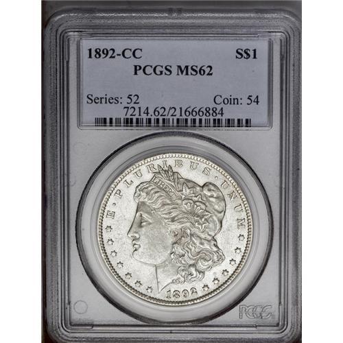 <B>1892-CC<img border='0' src='http://www.heritagecoins.com/images/star.gif' width=10 height=10>$1> MS62 PCGS.</B></I> This is quite well defined with frosty silver luster and no indication of toning. Attractive and desirable.