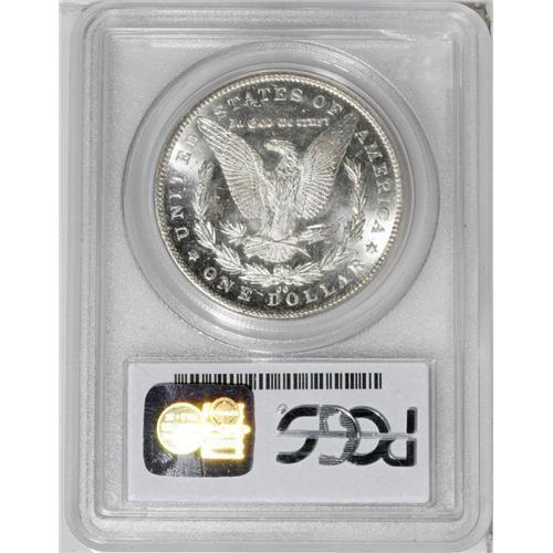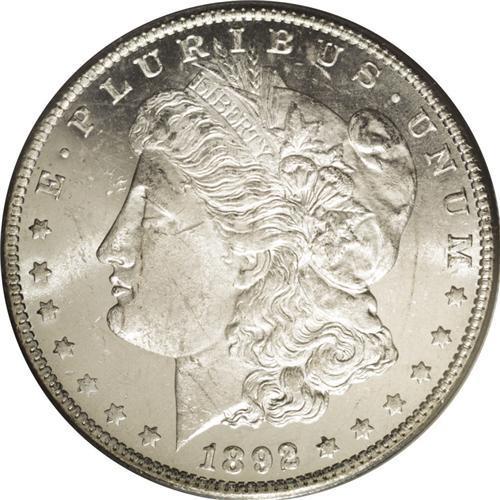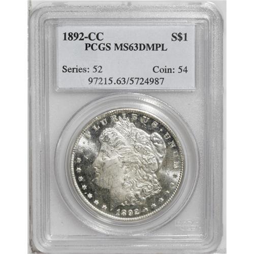 <B>1892-CC<img border='0' src='http://www.heritagecoins.com/images/star.gif' width=10 height=10>$1> MS63 Deep Mirror Prooflike PCGS.</B></I> A bare hint of tan toning visits Liberty's cheek, but most collectors would regard this prominently mirrored piece as fully brilliant. A nicely struck example of this more difficult Carson City date. The legendary GSA hoard included only a single 1892-CC dollar. Population: 43 in 63, 29 finer (7/06).
