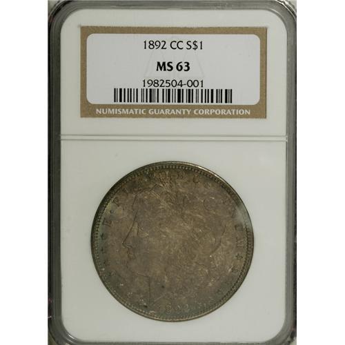 <B>1892-CC S$1 MS63 NGC.</B></I> Luxuriously toned with deep tobacco-brown centers and peripheral olive-gold and sky-blue shades. A crisply struck and satiny CC-mint dollar with lovely eye appeal for the MS63 level.<BR><BR><b>Shipping:</b> Coins & Currency (<a target="_blank" href="http://www.heritageauctions.com/common/shipping.php">view shipping information</a>)