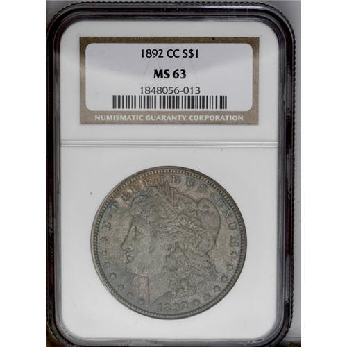 <B>1892-CC<img border='0' src='http://www.heritagecoins.com/images/star.gif' width=10 height=10>$1> MS63 NGC.</B></I> Silver-gray and mauve surfaces show whispers of iridescent cobalt-blue and lavender around the borders. Nice execution is seen on the design features, including partial definition in the hair over Liberty's ear. A couple of trivial marks are scattered about, and the luster is somewhat subdued by the depth of the toning.<BR><I>From The Lewis (Tahoe) Collection.</B></I>