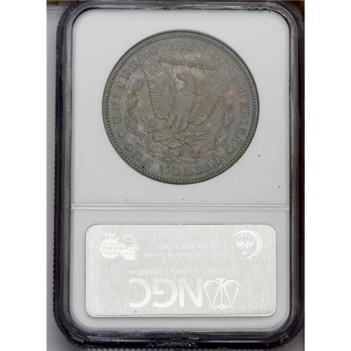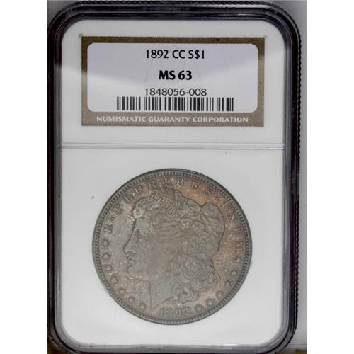<B>1892-CC<img border='0' src='http://www.heritagecoins.com/images/star.gif' width=10 height=10>$1> MS63 NGC.</B></I> This 1892-CC Morgan displays a mix of medium intensity sky-blue, gray, orange, and lavender patination that delicately overlies pleasing luster. Nice definition is apparent on the design elements, including partial delineation in the hair over Liberty's ear and on the eagle's breast feathers. A linear mark nearly concealed by the toning is noted on the cheek.<BR><I>From The Lewis (Tahoe) Collection.</B></I>