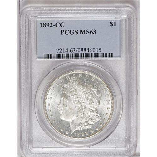<B>1892-CC<img border='0' src='http://www.heritagecoins.com/images/star.gif' width=10 height=10>$1> MS63 PCGS.</B></I> A frosty Mint State example with brilliant silver luster and splashes of pale gold color on Liberty's cheek. A pleasing and desirable example.
