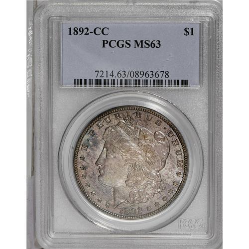 <B>1892-CC<img border='0' src='http://www.heritagecoins.com/images/star.gif' width=10 height=10>$1> MS63 PCGS.</B></I> Blue and violet merge with the steel-gray patina on this subtly lustrous and sharply struck coin. The fields and devices are exceptionally clean.