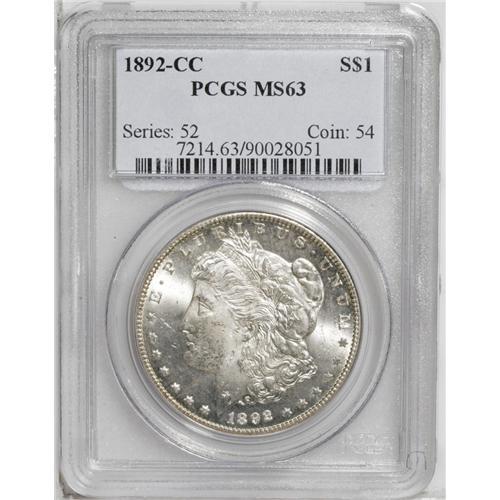 <B>1892-CC<img border='0' src='http://www.heritagecoins.com/images/star.gif' width=10 height=10>$1> MS63 PCGS.</B></I> Full mint frost is typical for Uncirculated examples of this issue. However, the surfaces are surprisingly clean for the grade.