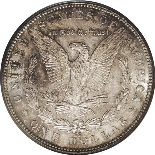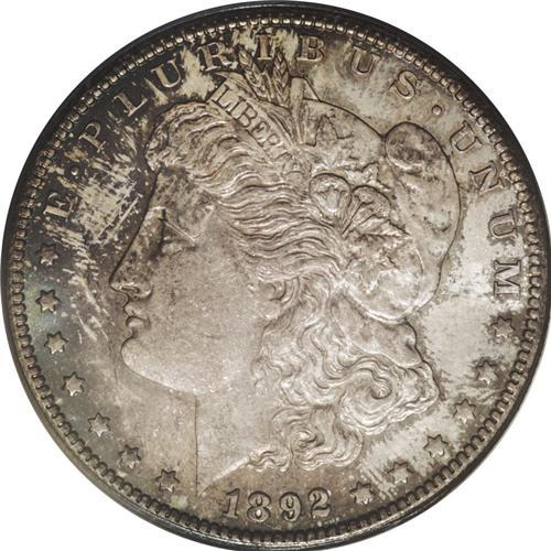 <B>1892-CC<img border='0' src='http://www.heritagecoins.com/images/star.gif' width=10 height=10>$1> MS63 PCGS.</B></I> Fully patinated in pearl-gray, cobalt-blue, and plum swaths. Crisply struck and only lightly marked. Satin luster is evident, although subdued by the rich toning. Like the 1889-CC and 1893-CC, the 1892-CC went unrepresented in the famous GSA hoard of Carson City dollars.