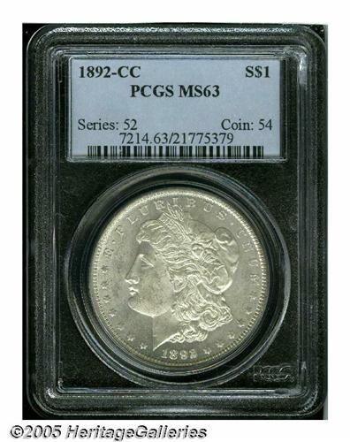 <B>1892-CC<S$1> MS63 PCGS.</B></I> Sharply struck and fully brilliant. The devices are frosty and the fields are satiny. According to Walter Breen, many of the Uncirculated specimens now extant were once part of the famous Redfield Hoard.