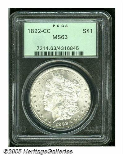 <B>1892-CC<S$1> MS63 PCGS.</B></I> Softly detailed above the ear, but sharply struck otherwise, with bold clash marks (as struck) in the reverse fields and a typical number of scattered minor abrasions for the MS63 grade level. Untoned and fully lustrous.
