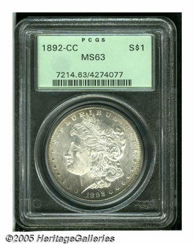 <B>1892-CC<S$1> MS63 PCGS.</B></I> Wisps of light russet toning visit the peripheries. The design elements are generally adequately struck, but the hair above Liberty's ear is noticeably weak. Luster grazes on Liberty's cheek help to limit the grade.