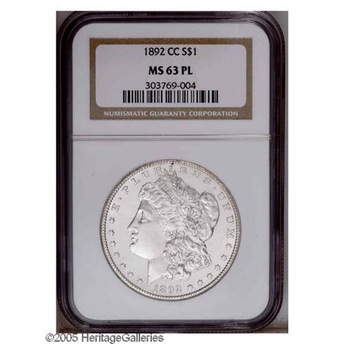 <B>1892-CC<S$1> MS63 Prooflike NGC.</B></I> Well struck with sparkling, untoned, Prooflike surfaces. Mild scuffiness on Liberty's cheek, and in the left obverse field, and a handful of small abrasions on the eagle's breast, prevent a higher grade assessment. Census: 76 in 63 Prooflike, 51 finer in Prooflike condition (11/05).