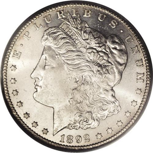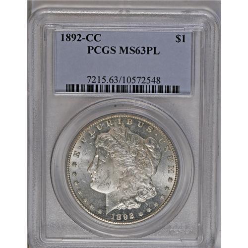<B>1892-CC<img border='0' src='http://www.heritagecoins.com/images/star.gif' width=10 height=10>$1> MS63 Prooflike PCGS.</B></I> Sharply struck and fully lustrous, this lovely Morgan silver dollar exhibits considerable eye appeal. Slightly abraded on the obverse, but pristine on the reverse. In fact, the reverse appears to be at least two full grade points finer than the obverse.