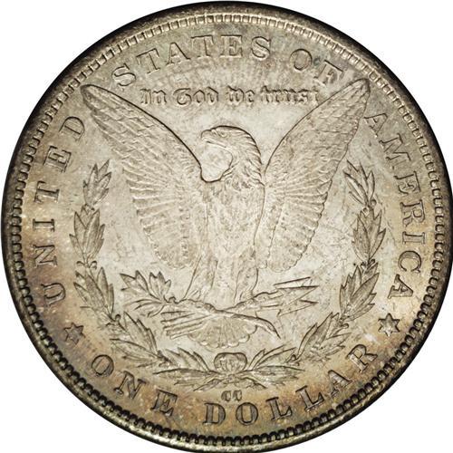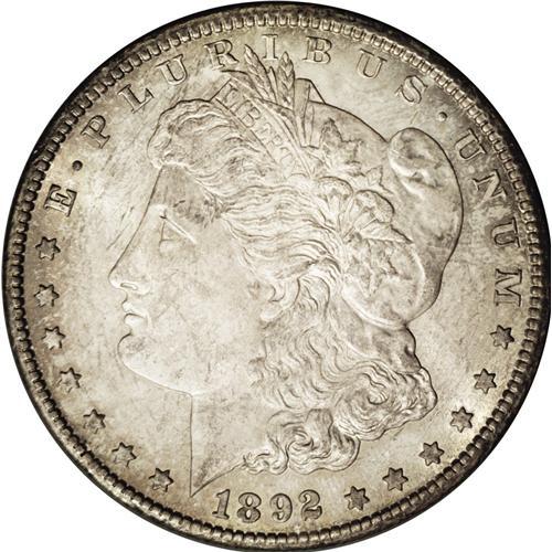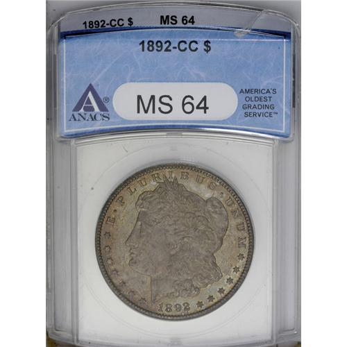 <B>1892-CC<img border='0' src='http://www.heritagecoins.com/images/star.gif' width=10 height=10>$1> MS64 ANACS.</B></I> Quantities of the 1892-CC dollar were paid out between from 1925 through 1955, but apparently all were gone by the time of the Treasury release of 1962-1964. This is a highly lustrous coin, as one would expect, with bright, semi-reflective fields. Each side is overlaid with hazy gray-lilac toning that turns rose around the margins. Sharply struck. Accompanied by a David Bullowa envelope with a four-digit lot number stamped on it that ends in 622, meaning this piece was sold last prior to 1958.<BR><I>From The Lewis (Tahoe) Collection.</B></I>