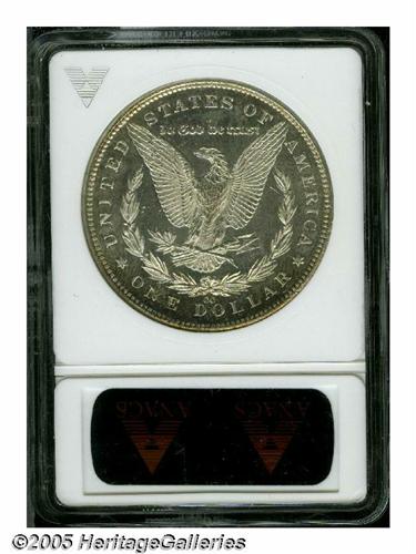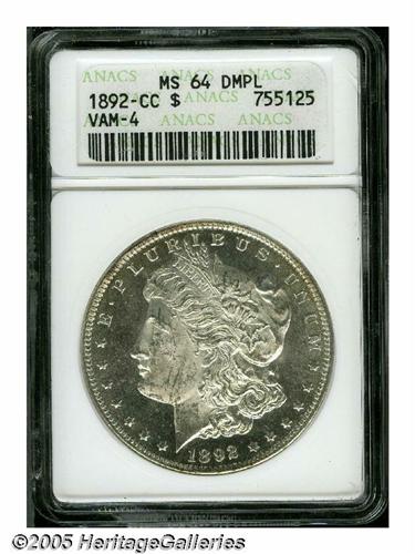 <B>1892-CC<S$1> MS64 Deep Mirror Prooflike ANACS.</B></I> VAM-4, R.4. Light gold-rose color at the margins. The second C in the mintmark is obviously repunched. Sharply struck with deep mirrored fields, but a minor scrape impacts the N in ONE. Struck from lightly clashed dies.