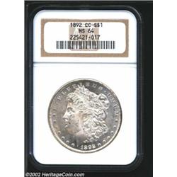 1892-CC S$1 MS64 NGC. The left obverse has dusky tan-gray patina. The lower half of the 2 in the dat