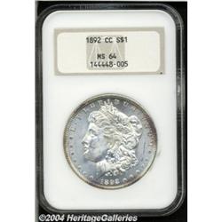<B>1892-CC<S$1> MS64 NGC.</B></I> The satiny, essentially untoned surfaces show deep purple color at selected border areas. Minimally marked, but limited in grade by pronounced weakness at the centers of the obverse and reverse. <BR><BR><B>Important notice:</B> Heritage usually auctions material at the rate of 200-250 lots per hour. On some occasions eBay Live bid software or the Internet may not be able to keep up with the pace of the auction. We recommend placing a realistic absentee bid now as insurance to avoid disappointment. Occasionally the auctioneer may eliminate or reject an eBay Live bid, and the auctioneer may also reopen a lot after the close of the eBay live bidding (usually because we missed an audience bid), and may reject your bid even if it shows you as the winning bidder. By bidding via eBay Live, you agree that Heritage may award the lot to another bidder at its sole discretion under the circumstances described above or any other reasonable circumstances. Since eBay bids are not shown to us until we open the lot on the floor, we treat those bids just like floor bids. In most cases the floor responds before the eBay bid is presented to us, due to Internet lag time, so for consistency we have made it a policy that floor bids are always considered first over tie eBay live bids. Also please note that all Heritage lots purchased through eBay Live carry a 20% Buyer's Premium. Please make sure you read the Terms and Conditions before you bid. </span></font></tr></table></td></tr></table>