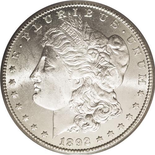 <B>1892-CC<img border='0' src='http://www.heritagecoins.com/images/star.gif' width=10 height=10>$1> MS64 PCGS.</B></I> A totally white coin that retains strong eye appeal and excellent surfaces for the grade. As usual, the curls on Liberty's ear are slightly weak, but the eagle's breast feathers show full separation. This is one of the more difficult dates to obtain, and one that costs considerably more in a grade point finer.