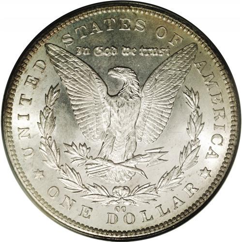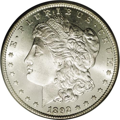 <B>1892-CC<img border='0' src='http://www.heritagecoins.com/images/star.gif' width=10 height=10>$1 MS64 PCGS.</B></I> Frosty-white and particularly sharp for this scarcer Carson City dollar, with only a few modest abrasions on and about Liberty's portrait. Just a hint of reddish-golden color is seen at the reverse periphery.