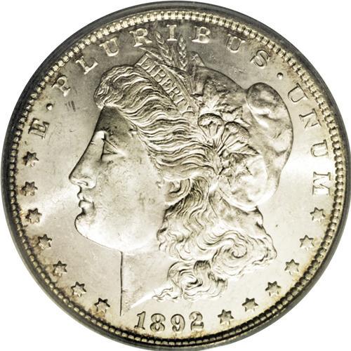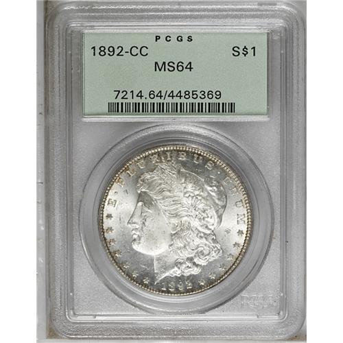 <B>1892-CC<img border='0' src='http://www.heritagecoins.com/images/star.gif' width=10 height=10>$1> MS64 PCGS.</B></I> Golden-brown freckles visit the margins, but this sharply struck example is generally untoned. Booming luster and clean fields confirm the quality. The cheek has a few minor grazes. While most Carson City Morgan dates emerged in quantity from the GSA hoard, the 1892-CC was an exception. Housed in a green label holder.