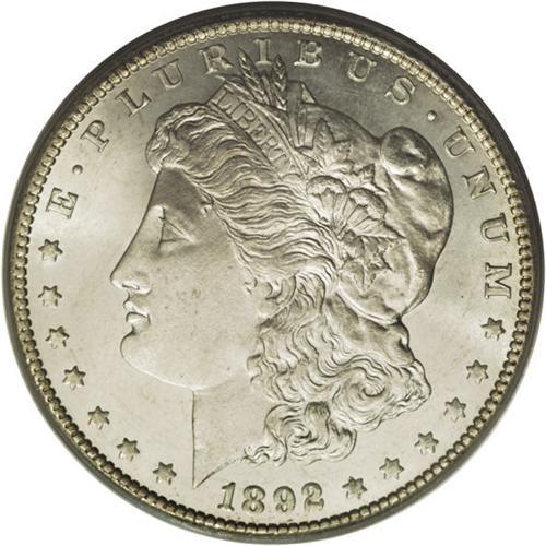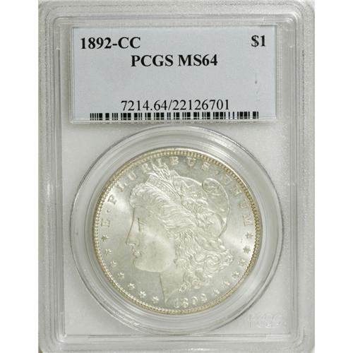 <B>1892-CC S$1 MS64 PCGS.</B></I> In comparison to some of the 1878-1885 Carson City Morgan dollar issues that were sold in large quantities in the 1970s, by the General Services Administration, the 1892-CC is "relatively elusive", according to Q. David Bowers (1993). This near-Gem is well struck, lustrous, and essentially untoned, with just a touch of cloudiness in the fields. Clockwise die rotation is noted on the order of approximately twenty-five degrees. The obverse is nearly blemish-free, and Liberty's cheek is pristine, as a few tiny marks in the reverse fields seem to preclude a Gem grade assessment.<BR><BR><b>Shipping:</b> Coins & Currency (<a target="_blank" href="http://www.heritageauctions.com/common/shipping.php">view shipping information</a>)