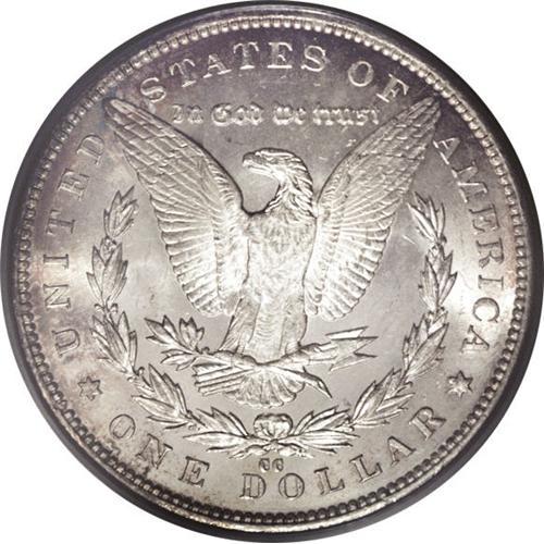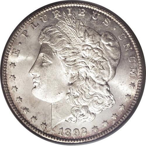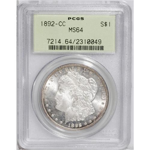 <B>1892-CC<img border='0' src='http://www.heritagecoins.com/images/star.gif' width=10 height=10>$1> MS64 PCGS.</B></I> Lightly frosted devices and lustrous surfaces. Dusky red-tinged toning covers both sides, mostly thinly, though a few concentrated spots appear, including in the hair above the ear and at places near the reverse periphery. An example with great eye appeal, housed in a green label holder.