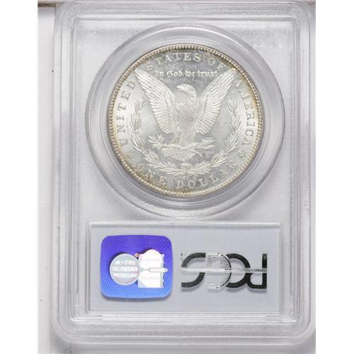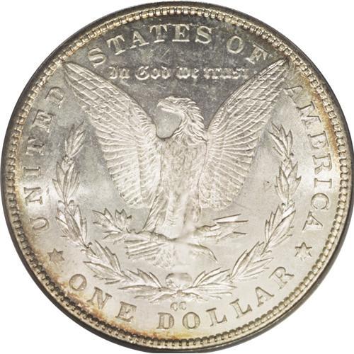<B>1892-CC<img border='0' src='http://www.heritagecoins.com/images/star.gif' width=10 height=10>$1> MS64 PCGS.</B></I> Magnificent fire-red, orange, ocean-blue, and emerald-green toning fully consumes the obverse. The reverse is comparatively tranquil, with peripheral peach patina and cream-gray fields. This satiny better date Carson City dollar shows slight incompleteness of strike above Liberty's ear, but the reverse is remarkably clean and the obverse possesses only inconspicuous marks.