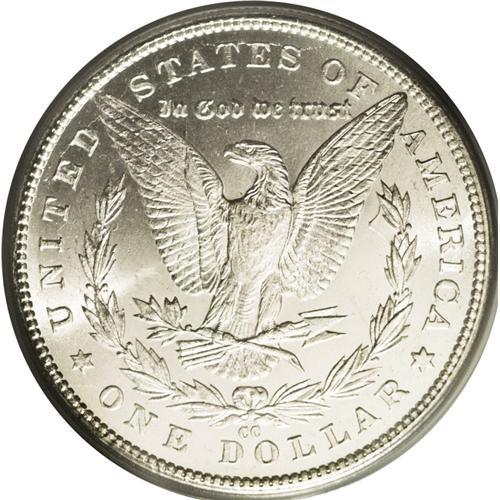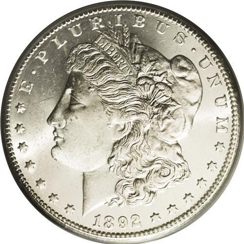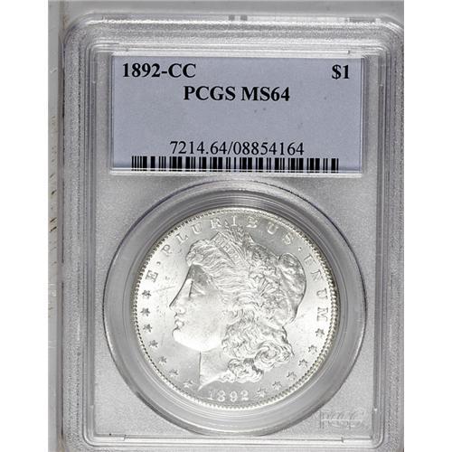 <B>1892-CC<img border='0' src='http://www.heritagecoins.com/images/star.gif' width=10 height=10>$1> MS64 PCGS.</B></I> Most Mint State 1892-CC dollars are in lower grades and are often bagmarked. The near-Gem example we offer in this lot exhibits marvelously preserved surfaces. Were it not for unobtrusive light luster grazes on Liberty's cheek and the left obverse field, this piece would have an even higher grade. Radiant luster characterizes both sides, which are fully brilliant and completely untoned. All of the design elements are sharply struck, with only minor softness seen in the hair over Liberty's ear.