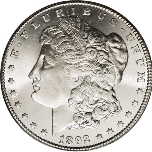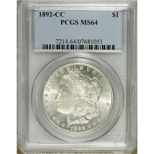 <B>1892-CC S$1 MS64 PCGS.</B></I> One of the more desirable Carson City Mint Morgan dollars, here represented by a brilliant, untoned near-Gem example. This piece appears quite high-end for the grade, although a few abrasions around Liberty's eye prevent a higher grade. Yet the strike is good save for some weakness on the hair over the ear, the scintillating luster is pleasing, and the eye appeal is considerable. Many spindly die cracks are seen on both sides under a loupe.<BR><BR><b>Shipping:</b> Coins & Currency (<a target="_blank" href="http://www.heritageauctions.com/common/shipping.php">view shipping information</a>)