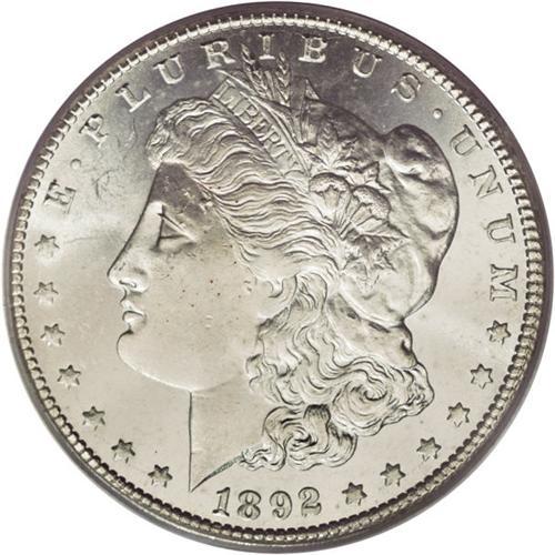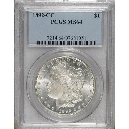 <B>1892-CC S$1 MS64 PCGS.</B></I> One of the more desirable Carson City Mint Morgan dollars, here represented by a brilliant near-Gem example. This piece appears quite high-end for the grade, although a few abrasions around Liberty's eye prevent a higher grade. Yet the strike is good save for some weakness on the hair over the ear, the scintillating luster is pleasing, and the eye appeal is considerable. Many spindly die cracks are seen on both sides under a loupe.<BR><BR><b>Shipping:</b> Coins & Currency (<a target="_blank" href="http://www.heritageauctions.com/common/shipping.php">view shipping information</a>)