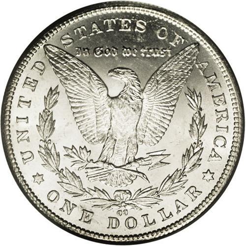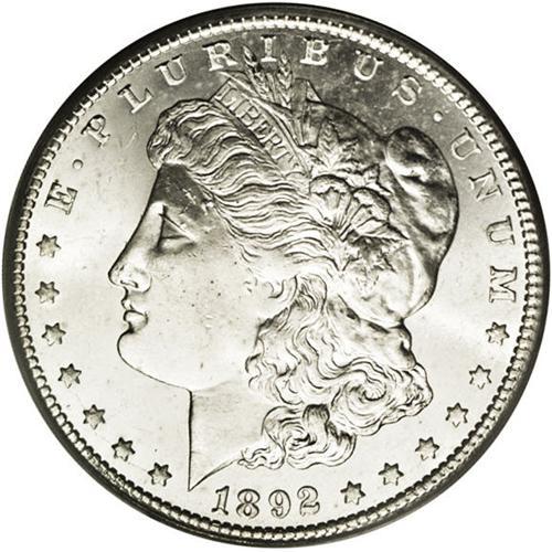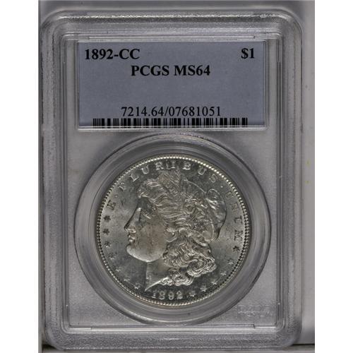 <B>1892-CC<img border='0' src='http://www.heritagecoins.com/images/star.gif' width=10 height=10>$1> MS64 PCGS.</B></I> One of the more desirable of the Carson City Mint Morgan dollars, here represented by a brilliant, untoned near-Gem example. This piece appears quite high-end for the grade, although a few abrasions around Liberty's eye prevent a higher grade. Yet the strike is bold save for some weakness on the hair over the ear, the scintillating luster is breathtaking, and the eye appeal is enormous. Many light hairline die cracks are seen on both sides under a loupe.