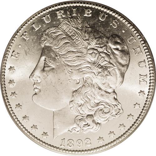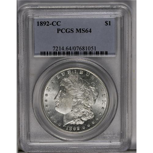 <B>1892-CC S$1 MS64 PCGS.</B></I> One of the more desirable of the Carson City Mint Morgan dollars, here represented by a brilliant, untoned near-Gem example. This piece appears quite high-end for the grade, although a few abrasions around Liberty's eye prevent a higher grade. Yet the strike is good save for some weakness on the hair over the ear, the scintillating luster is pleasing, and the eye appeal is considerable. Many spindly die cracks are seen on both sides under a loupe.<BR><BR><b>Shipping:</b> Coin/Currency (<a target="_blank" href="http://www.heritageauctions.com/common/shipping.php">view shipping information</a>)