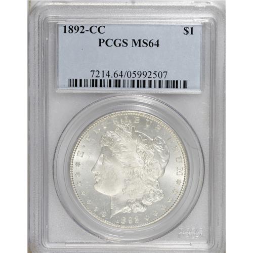 <B>1892-CC S$1 MS64 PCGS.</B></I> Substantial mint frost enlivens the surfaces of this blazing, snow-white dollar. Well struck with a few wispy marks that keep it from the Gem category, but have minimal impact on the overall eye appeal of the piece. A truly lovely near-Gem from the Carson City Mint.<BR><BR><b>Shipping:</b> Coins & Currency (<a target="_blank" href="http://www.heritageauctions.com/common/shipping.php">view shipping information</a>)