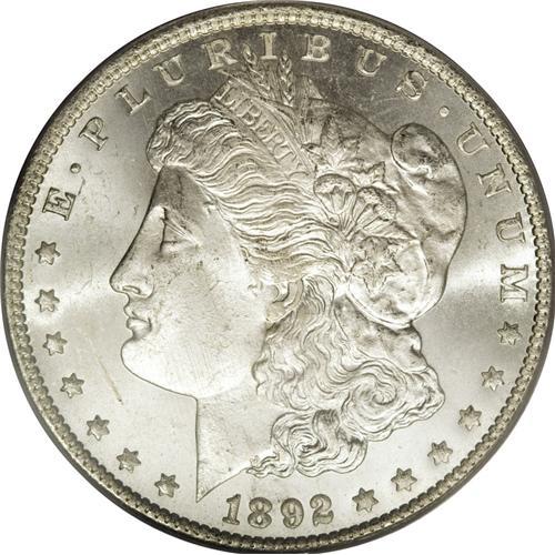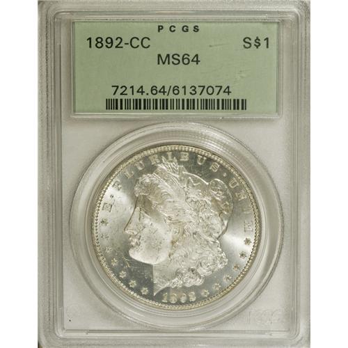 <B>1892-CC S$1 MS64 PCGS.</B></I> This scarcer date Carson City dollar has dazzling luster and only a wisp of golden patina. The centers display a few faint roller marks, as made, but the strike is generally bold. Well preserved except for a thin mark on the field near the chin. Encapsulated in a green label holder.<BR><BR><b>Shipping:</b> Coins & Currency (<a target="_blank" href="http://www.heritageauctions.com/common/shipping.php">view shipping information</a>)