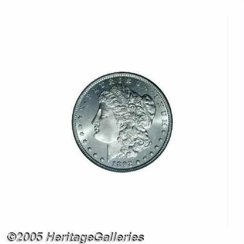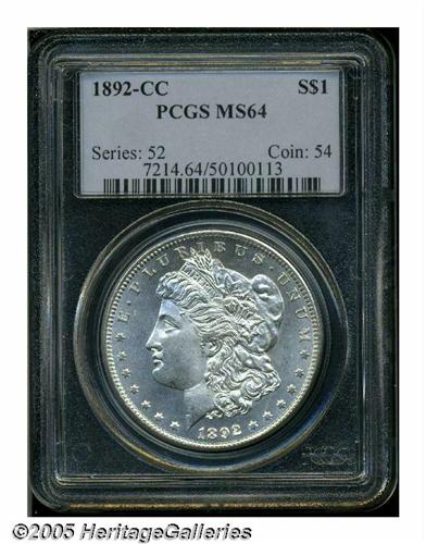 <B>1892-CC<S$1> MS64 PCGS.</B></I> Untoned with excellent sharpness in the centers, radiant luster, and chalk-white features. The eye appeal here is far superior to most similarly graded '92-CC Dollars.