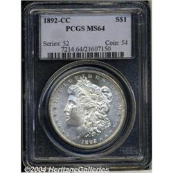 <B>1892-CC<S$1> MS64 PCGS.</B></I> A highly lustrous example with a crisp strike. Brilliant aside from a hint of tan color within Liberty's hair. The fields are very clean, and only a few faint luster grazes on the portrait deny a full Gem assessment. The penultimate Carson City issue, the 1892-CC was not well represented in the GSA hoard and is scarce in Mint State. <BR><BR><B>Important notice:</B> Heritage usually auctions material at the rate of 200-250 lots per hour. On some occasions eBay Live bid software or the Internet may not be able to keep up with the pace of the auction. We recommend placing a realistic absentee bid now as insurance to avoid disappointment. Occasionally the auctioneer may eliminate or reject an eBay Live bid, and the auctioneer may also reopen a lot after the close of the eBay live bidding (usually because we missed an audience bid), and may reject your bid even if it shows you as the winning bidder. By bidding via eBay Live, you agree that Heritage may award the lot to another bidder at its sole discretion under the circumstances described above or any other reasonable circumstances. Since eBay bids are not shown to us until we open the lot on the floor, we treat those bids just like floor bids. In most cases the floor responds before the eBay bid is presented to us, due to Internet lag time, so for consistency we have made it a policy that floor bids are always considered first over tie eBay live bids. Also please note that all Heritage lots purchased through eBay Live carry a 20% Buyer's Premium. Please make sure you read the Terms and Conditions before you bid. </span></font></tr></table></td></tr></table>
