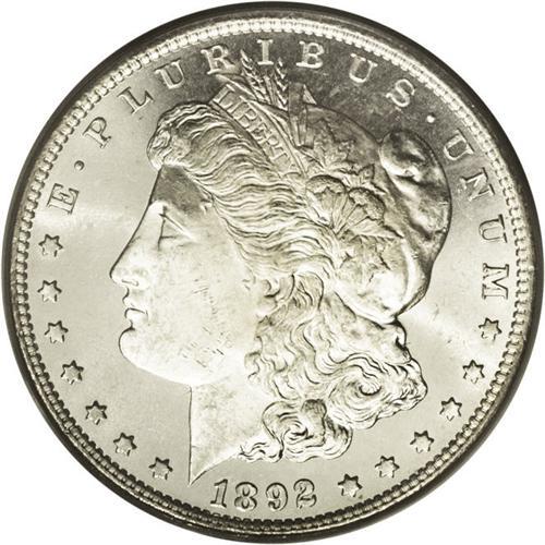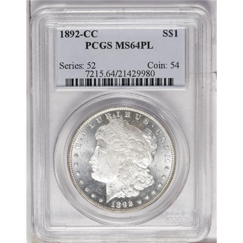 <B>1892-CC<img border='0' src='http://www.heritagecoins.com/images/star.gif' width=10 height=10>$1> MS64 Prooflike PCGS.</B></I> A scarcer Carson City dollar with deeply reflective fields, and one that is usually only seen in MS63 or lower grades. This is a nicely cameoed example that is fully brilliant and shows a typical amount of small contact marks on the obverse that serve to limit the grade. Worthy of a strong bid. Population: 66 in 64 Prooflike, 10 finer (7/06).<BR><I>From The New York Eye Appeal Collection.</B></I>