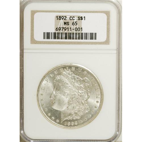 <B>1892-CC S$1 MS65 NGC.</B></I> A satiny white coin with radiant luster, excellent surfaces, and a decent strike on the central devices. One of the scarcer and always popular Carson City issues, and an elusive coin in Gem grade. Examination of the surfaces reveals a clean cheek on Liberty, and the surrounding fields are free of all but a smattering of little nicks.<BR><BR><b>Shipping:</b> Coins & Currency (<a target="_blank" href="http://www.heritageauctions.com/common/shipping.php">view shipping information</a>)