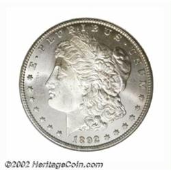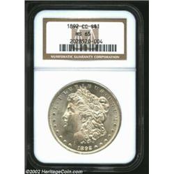 1892-CC S$1 MS65 NGC. Fully struck with bright mint frost and just a touch of light patina. It is unusual to locate two examples of this scarcer Carson City issue in the same auction, both in Gem condition. An exceptional coin and a rare opportunity for the advanced Morgan collector. Population: 92 in 65, 9 finer (7/02). Important notice: We expect to be auctioning lots at the rate of 200-250 per hour. Sometimes eBay Premier live bid software cannot keep up with that pace, so we strongly recommend that you place a realistic proxy bid now as insurance to avoid disappointment. Also please note that all Heritage/CAA lots purchased through eBay Premier carry a 20% Buyer's Premium. Please make sure you read the Terms and Conditions.