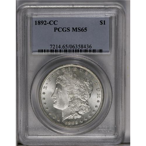 <B>1892-CC<img border='0' src='http://www.heritagecoins.com/images/star.gif' width=10 height=10>$1> MS65 PCGS.</B></I> A highly lustrous example that presents a snow-white appearance over each side. Boldly struck with light frosting on the devices, with plenty of eye appeal from the brilliant surfaces. The surfaces are largely free of abrasions, with only a few light ticks evident. Scarce as a Gem.