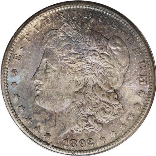1892-CC S$1 MS65 PCGS. A mixture of deep gray, rose, a