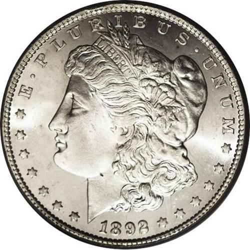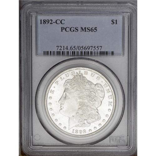 <B>1892-CC<img border='0' src='http://www.heritagecoins.com/images/star.gif' width=10 height=10>$1> MS65 PCGS.</B></I> Although Liberty's jaw has nearly imperceptible roller marks (as made), this is a boldly struck piece with little of the often-encountered weakness in the centers, the claws, or the lower wreath. The cartwheel sheen in the fields contrasts nicely with heavily frosted features. Surface marks, of course, are few and far between. 1892 was the penultimate year of operation for the Carson City Mint, and the production of silver dollars at that facility was considerably reduced from that of the two preceding years. <BR><BR><B>Important notice:</B> Heritage usually auctions material at the rate of 200-250 lots per hour. On some occasions eBay Live bid software or the Internet may not be able to keep up with the pace of the auction. We recommend placing a realistic absentee bid now as insurance to avoid disappointment. Occasionally the auctioneer may eliminate or reject an eBay Live bid, and the auctioneer may also reopen a lot after the close of the eBay live bidding (usually because we missed an audience bid), and may reject your bid even if it shows you as the winning bidder. By bidding via eBay Live, you agree that Heritage may award the lot to another bidder at its sole discretion under the circumstances described above or any other reasonable circumstances. Since eBay bids are not shown to us until we open the lot on the floor, we treat those bids just like floor bids. In most cases the floor responds before the eBay bid is presented to us, due to Internet lag time, so for consistency we have made it a policy that floor bids are always considered first over tie eBay live bids. Also please note that all Heritage lots purchased through eBay Live carry a 20% Buyer's Premium. Please make sure you read the Terms and Conditions before you bid. This lot is being auctioned in conjunction with a live floor auction by Heritage Galleries & Auctioneers. All final auction and invoice information will be supplied by Heritage Galleries & Auctioneers, and all other information should be considered preliminary. Lot:3598 <BR><BR><B>Winning Notification and Billing:</B> After the FINAL session in this auction is complete, Heritage will send e-mail and snail mail invoices. This process normally takes several days. All final auction and invoice information will be supplied by Heritage Galleries & Auctioneers, and all other information should be considered preliminary. <BR><BR>This auction will be conducted on a live auction floor and over the Internet through eBay Live. If you choose to place an absentee bid, please take a moment to <font color='#0000ff'><u><a href='http://pages.ebay.com/liveauctions/help/before/laabsentee.html'>learn how eBay Live absentee bidding works</a></u></font><font color='#000000'>