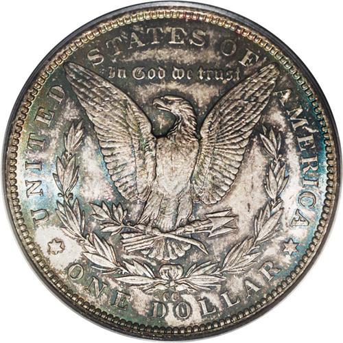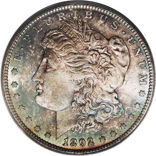 <B>1892-CC<img border='0' src='http://www.heritagecoins.com/images/star.gif' width=10 height=10>$1> MS65 PCGS.</B></I> Although not a common date, the 1892-CC Morgan silver dollar is also not one of the rarities in the series, although Gem examples are truly difficult to locate, especially with the eye appeal of this specimen. Both sides have pleasing golden-brown color with sea-green and iridescent toning, all over frosty silver luster. Just 22 finer non-prooflike examples of this date have been certified by PCGS.