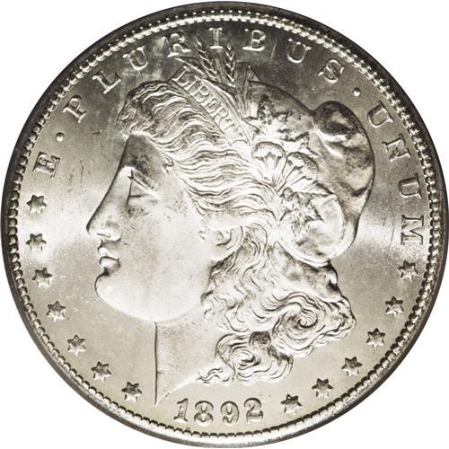<B>1892-CC<img border='0' src='http://www.heritagecoins.com/images/star.gif' width=10 height=10>$1> MS65 PCGS.</B></I> Bright, frosty, and essentially brilliant, with a slight ice-blue tint in the fields and crisply defined, snow-white devices. Faint weakness is noted above Liberty's ear, but her cheek is very clean and the coin's remaining surface areas are nearly mark-free. This penultimate Carson City issue is scarce at the Gem level of preservation, and rare any finer.