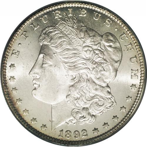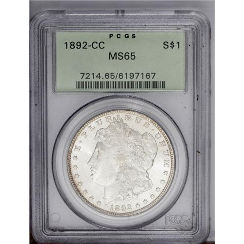 <B>1892-CC<img border='0' src='http://www.heritagecoins.com/images/star.gif' width=10 height=10>$1 MS65 PCGS.</B></I> One of the scarcer Carson City issues, and generally not appreciated as it is overshadowed by a few "key" date sisters. There were relatively few pieces represented in both the GSA and Redfield hoards, with availability in today's market being somewhat limited even in average Uncirculated condition. To find an example in Gem requires a bit of patience, and usually a healthy investment to obtain one. Many seen have a tendency to show moderate to heavy abrasions. The frosty-white example now offered is remarkably smooth for the issue and displays excellent sharpness over the primary devices. Housed in an older green insert PCGS holder. Population: 256 in 65, 21 finer (1/06).