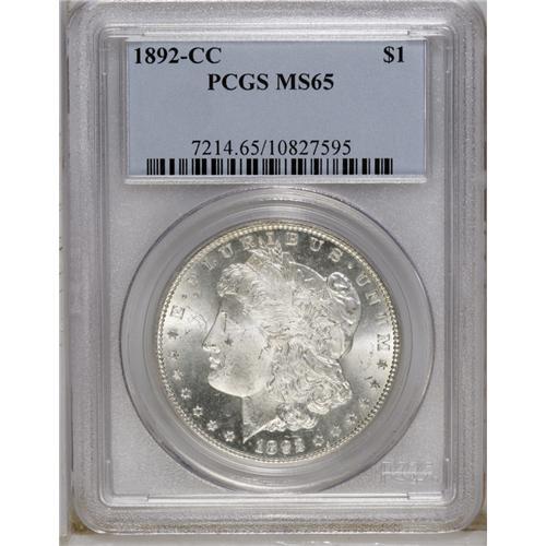 <B>1892-CC S$1 MS65 PCGS.</B></I> Solidly struck design features display nice detail in Liberty's hair and the eagle's breast feathers, and bright, essentially untoned surfaces radiate intense luster. Some light luster grazes do not subtract from the coin's great eye appeal. PCGS has seen only about 20 or so pieces grading finer.<BR><BR><b>Shipping:</b> Coin/Currency (<a target="_blank" href="http://www.heritageauctions.com/common/shipping.php">view shipping information</a>)