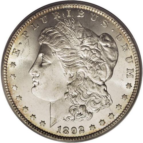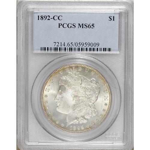<B>1892-CC S$1 MS65 PCGS.</B></I> Unlike most Carson City Morgan dollar issues, the 1892-CC had few (if any) pieces turn up in the Treasury releases of the 1960s, and Gem survivors are prized and elusive. Each side of this beautiful example has vibrant luster and light frost on the well-defined devices. Thin golden-orange toning graces the periphery, and small wisps of milky haze appear over the fields, but the remainder of the coin is bright and silver-white. A commendable representative of the penultimate Carson City dollar.<BR><BR><b>Shipping:</b> Coins & Currency (<a target="_blank" href="http://www.heritageauctions.com/common/shipping.php">view shipping information</a>)